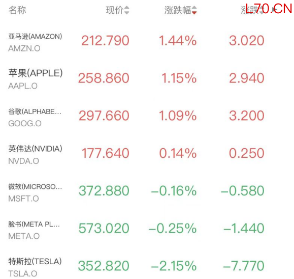 明星科技股涨跌互现,亚马逊、苹果和谷歌涨超1%,英伟达涨0.14%,微软、Meta小幅走低,特斯拉跌2.15%,摩根大通下调特斯拉盈利预期,警告其股价存60%下行空间。