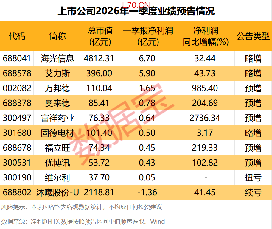 据证券时报·数据宝统计,截至3月24日,A股市场已有10家上市公司发布2026年一季度业绩预告。其中8家预增/略增,1家扭亏,1家续亏。以预告中值统计,海光信息、艾力斯、万邦德净利润规模超亿元,依次为6.7亿元、5.9亿元、1.65亿元。