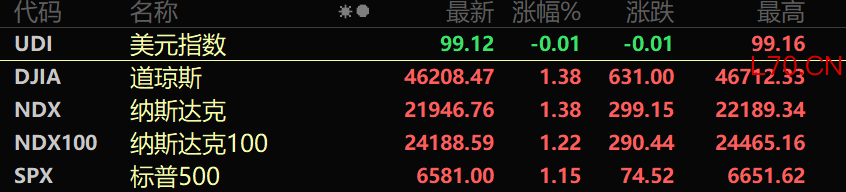 美股三大指数表现强势,道琼斯指数涨1.38%,纳斯达克综合指数涨1.38%;标普500指数涨1.15%,为2月6日以来最大单日涨幅。