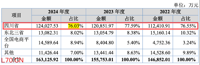 四川为菊乐股份贡献了绝大部分的业绩。2024年,公司在四川省内实现的收入为12.40亿元,占主营业务收入比重达76.03%。菊乐股份表示,由于“产能瓶颈使得公司在经营策略上需要优先满足本地区内的消费需求”。