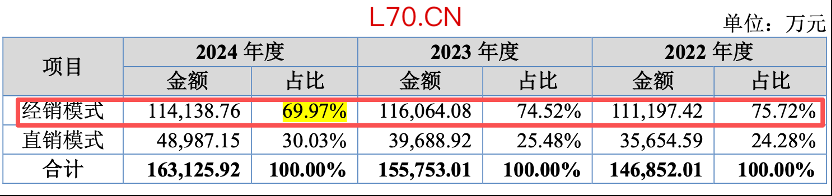 元股证券:ygzq.hk在渠道构成上,菊乐股份高度依赖传统的经销模式。2024年公司通过经销商实现的营业收入为11.41亿元,占主营业务收入的比例为69.97%。尽管这一模式能够帮助公司快速下沉至区县级市场,但经销商终端动销数据的透明度却始终是一块“短板”。