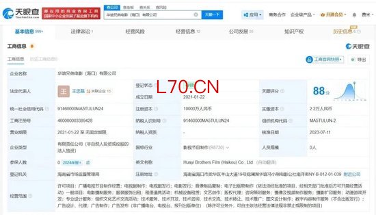 华谊兄弟电影(海口)有限公司成立于2021年1月,法定代表人为王忠磊,注册资本1亿人民币,经营范围包括广播电视节目制作经营、电视剧制作、电影发行等,由华谊兄弟电影有限公司全资持股。