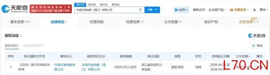 天眼查App显示,近日,华谊兄弟电影有限公司新增一则股权冻结信息,股权所在企业为华谊兄弟电影(海口)有限公司,冻结股权数额1亿人民币,执行法院为浙江省东阳市人民法院。