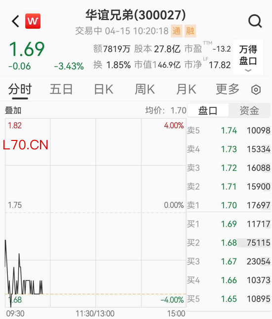 4月15日华谊兄弟股价下挫,截至10:20,跌3.43%报1.69元/股,市值为46.9亿元。