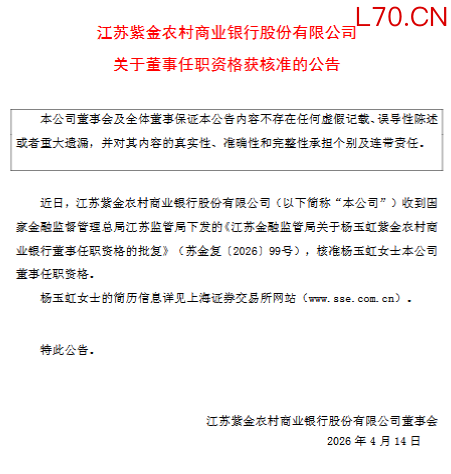 4月14日金融一线消息,紫金银行今日发布公告称,近日该行收到国家金融监督管理总局江苏监管局下发的《江苏金融监管局关于杨玉虹紫金农村商业银行董事任职资格的批复》(苏金复〔2026〕99号),核准杨玉虹公司董事任职资格。