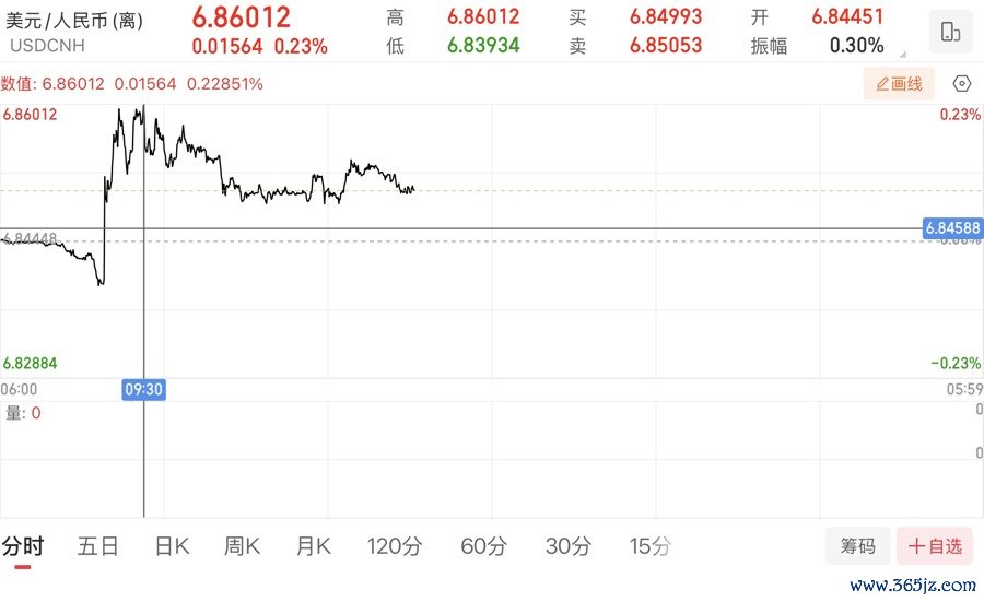 美元兑离岸人民币汇率盘中破6.86元。