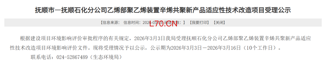 近期,抚顺市生态环境局发布了抚顺石化分公司乙烯部聚乙烯装置辛烯共聚新产品适应性技术改造项目环境影响报告书受理的公示。