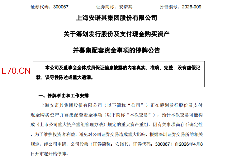 4月7日晚间,安诺其(300067)发布公告称,公司正在筹划发行股份及支付现金购买资产并募集配套资金事项,拟由公司通过发行股份及支付现金的方式购买标的公司广州烽云信息科技有限公司(以下简称“广州烽云”)控制权,并募集配套资金。