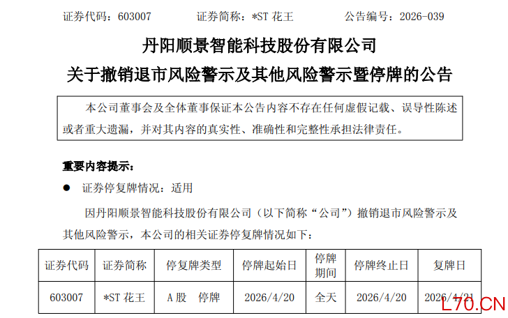 *ST花王(603007)4月17日晚公告,公司股票将于4月20日停牌一天,自4月21日起复牌并撤销退市风险警示及其他风险警示。撤销风险警示后,公司股票将转出风险警示板交易,简称变更为“花王股份”,公司股票价格的日涨跌幅限制由5%变更为10%。